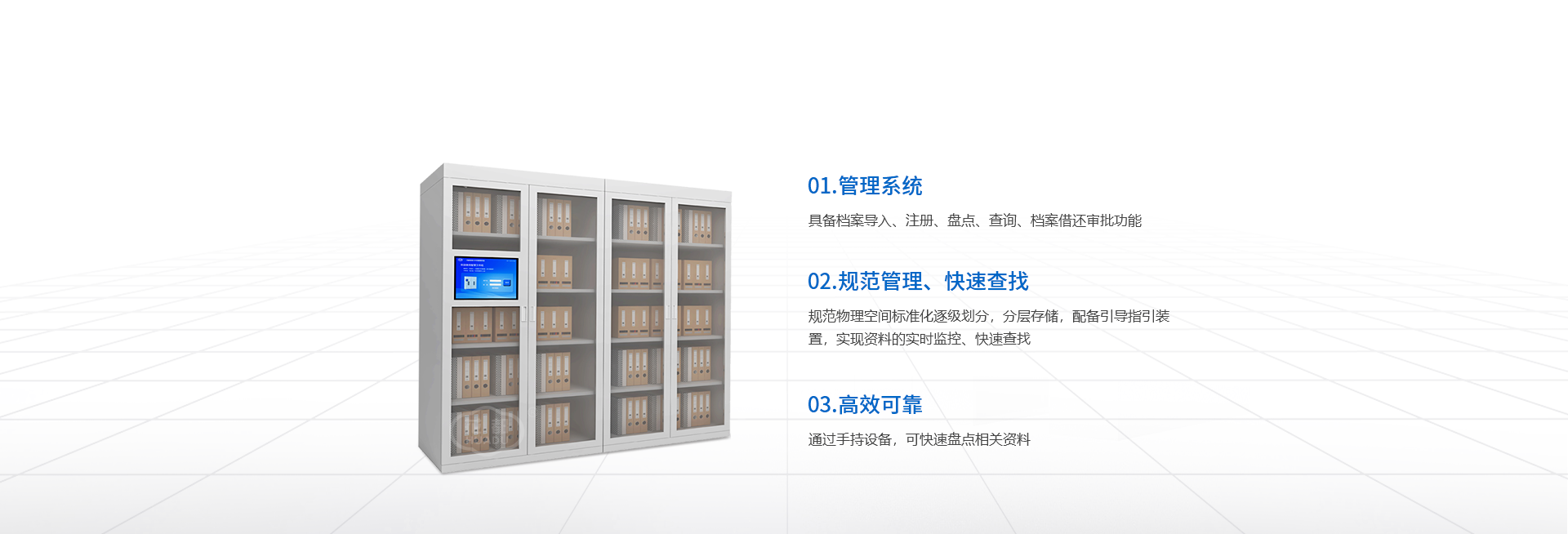 智慧文件柜HDW-RFID01為我司自主研發(fā)的一款實(shí)現(xiàn)資料實(shí)時(shí)監(jiān)控、精準(zhǔn)指引、快速盤點(diǎn)的文件存儲(chǔ)柜,采用整柜分層存儲(chǔ)的方式,單層物理標(biāo)準(zhǔn)劃分單元格,逐級(jí)標(biāo)準(zhǔn)劃分,規(guī)范化管理;每個(gè)位置配備引導(dǎo)指示裝置,實(shí)現(xiàn)資料的實(shí)時(shí)監(jiān)控、快速查找;引入RFID相關(guān)技術(shù),通過(guò)手持設(shè)備(支持全自動(dòng)盤點(diǎn))可快速盤點(diǎn)相關(guān)資料,高效且可靠;配套PC端管理系統(tǒng),可為用戶提供流程化、規(guī)范化、標(biāo)準(zhǔn)化的管理模式,廣泛應(yīng)用于黨、政、軍、企、公檢法等單位重要及保密文件的存儲(chǔ)和管理。